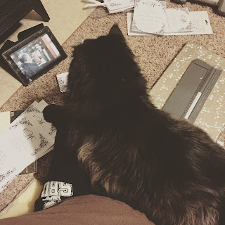I wanted to do gold card stock, but we had the invites printed on white paper and it looked strange with the colors we could get, so I decided to do a blue. I went with a package of card stock from Hobby Lobby that had different colors, so there are actually three different versions of our invites! It was cheaper that way, and while I may have started caring a bit more, I still didn’t want to spend money on them. It worked out kind of funny...